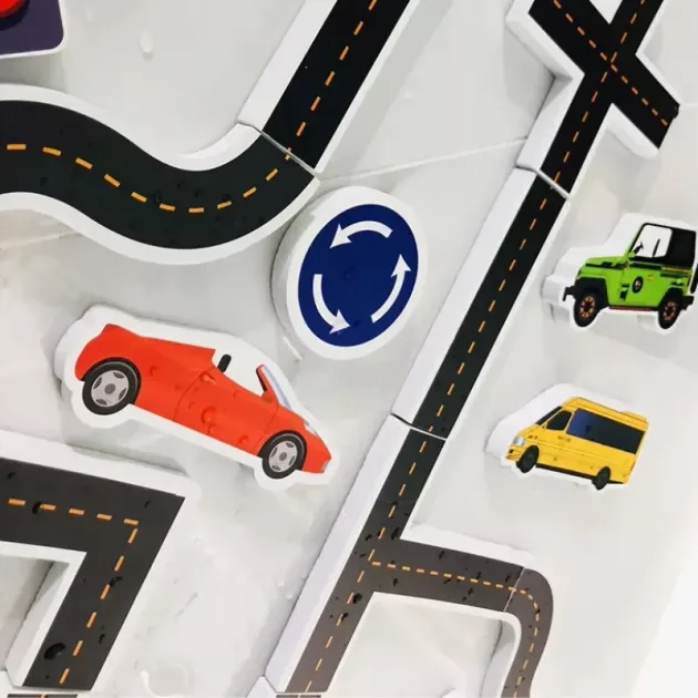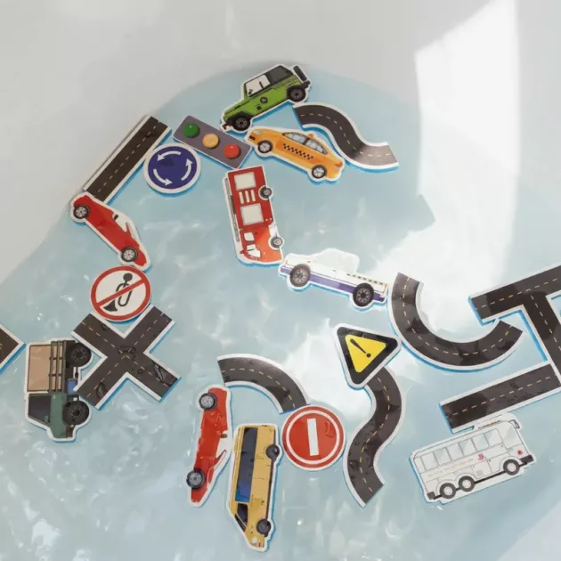 Coches, carreteras, señales—a mis hijos les encanta todo. Es una gran manera de practicar la motricidad fina en la bañera.