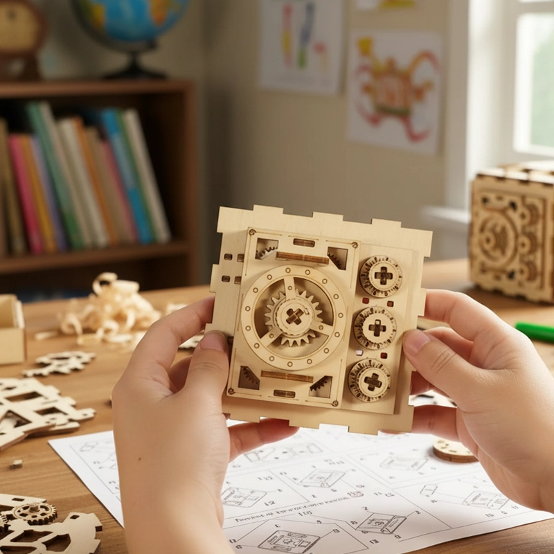 Mi hermana y yo construimos la caja fuerte de madera juntas. Las instrucciones eran claras y no necesitamos ayuda de adultos. ¡Ahora la uso para mis joyas!