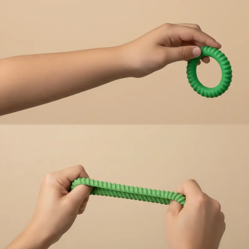 En el último recreo, mi amiga me dejó probar su pulsera elástica. Era suave y blanda, perfecta para calmarse.