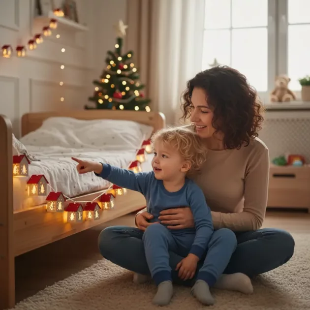 Me encanta cómo la guirnalda de casitas hace que cada noche se sienta especial. El tiempo en familia es mejor con ese brillo suave a nuestro alrededor.