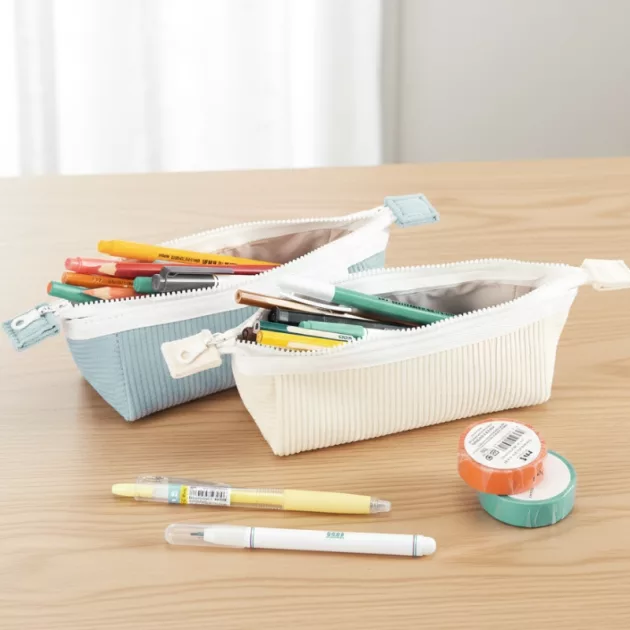 Este estuche para bolígrafos mantiene todos mis marcadores juntos así que nunca pierdo nada en la escuela. La pana se siente muy bien cuando lo sostengo también.