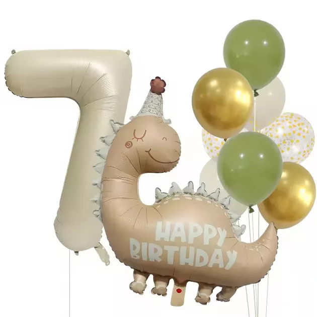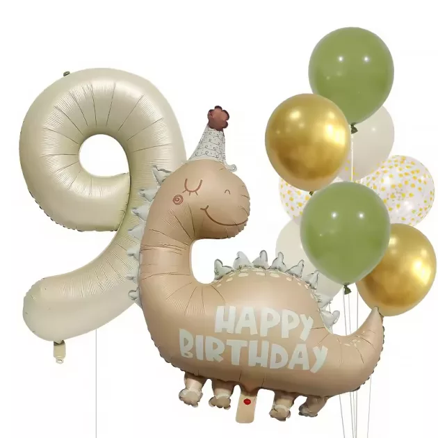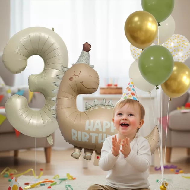 A mi primo se le cayó la mandíbula cuando vio el brillante globo de dinosaurio. ¡El globo con el número salió enorme en todas las fotos!