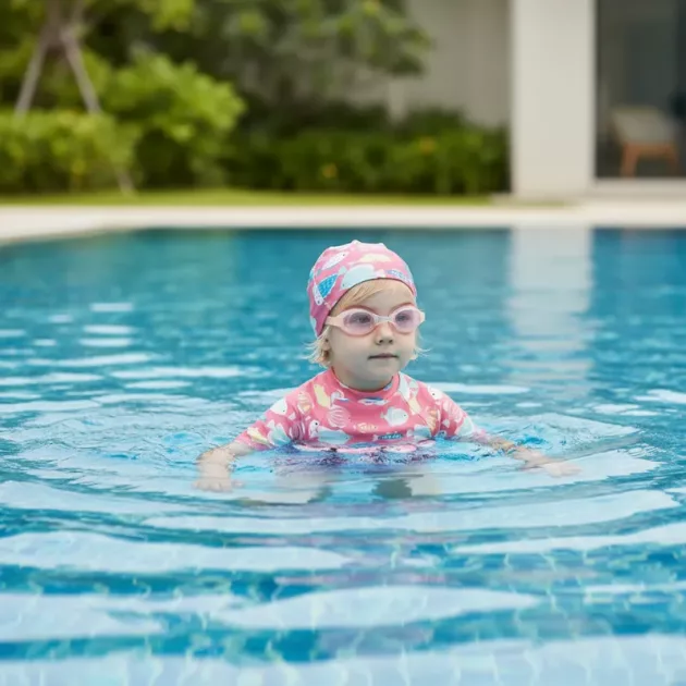 Me gusta que la gorra mantenga la cabeza cubierta y que el traje se seque rápido. Después de un rápido tentempié, mi hijo salta de nuevo directo a la piscina.