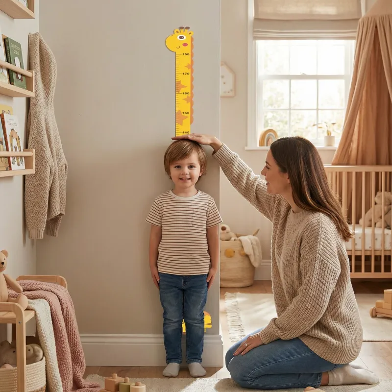 Elegimos la jirafa y queda perfecto junto al armario. El abuelo marca las alturas de los niños cuando visita. Ya se siente como una tradición.