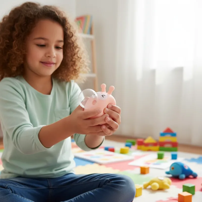 Mamá me dio el juguete de burbujas para ayudarme con los nervios antes de dormir. Ahora lo aprieto y me siento somnolienta y tranquila cada noche.