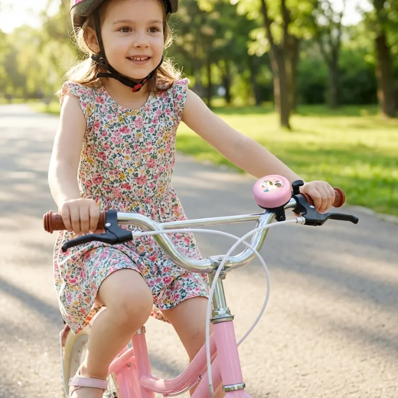 La añadimos a la bici rosa de mi sobrina. Las caritas graciosas de animales la hacen reír en cada paseo, y el timbre claro avisa a los corredores desde bien lejos de que venimos.