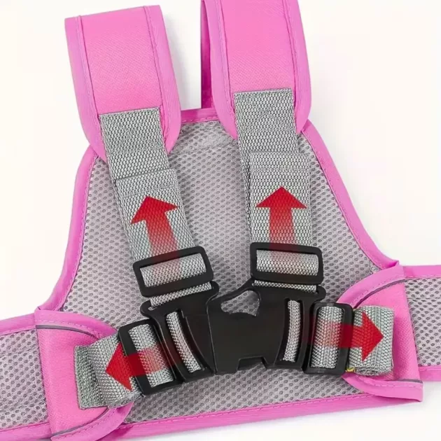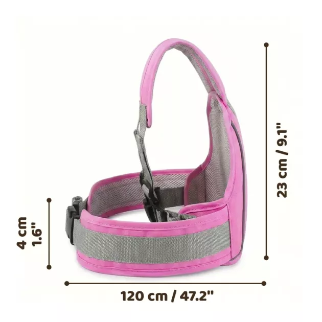Soporte seguro - El arnés ancho distribuye la presión suavemente por el pecho y la cintura. Las costuras reforzadas y los clips resistentes soportan los tirones durante los baches o el frenado.