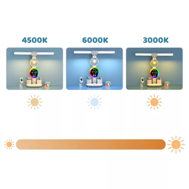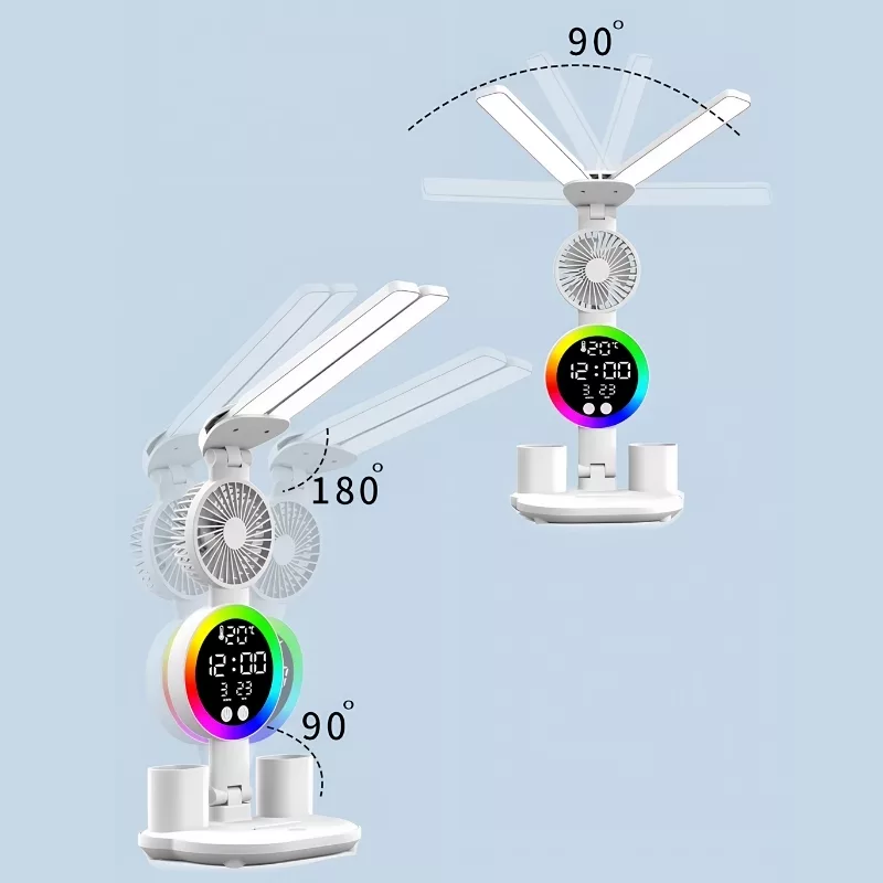Pongo alarmas con el reloj para terminar mi trabajo más rápido. La lámpara es agradable y el ventilador es suave pero me mantiene fresca.
