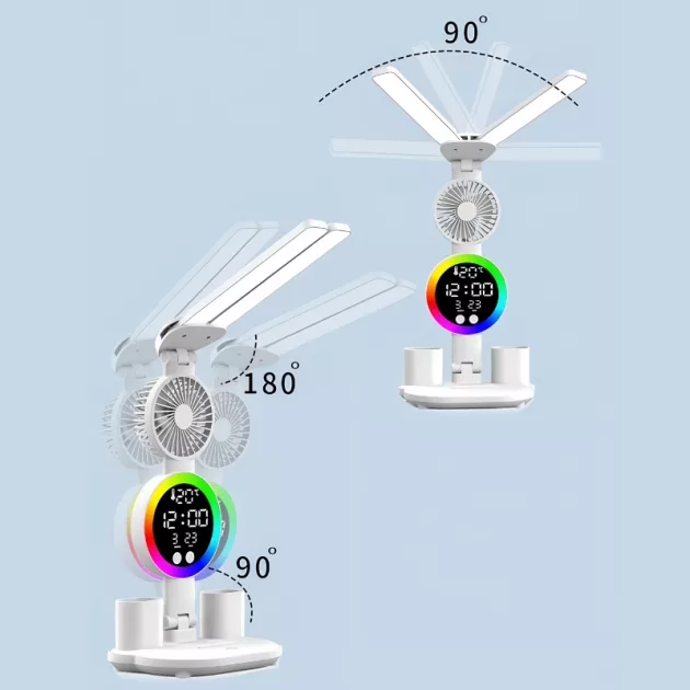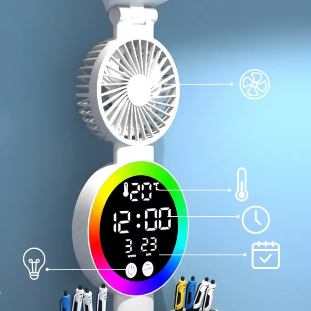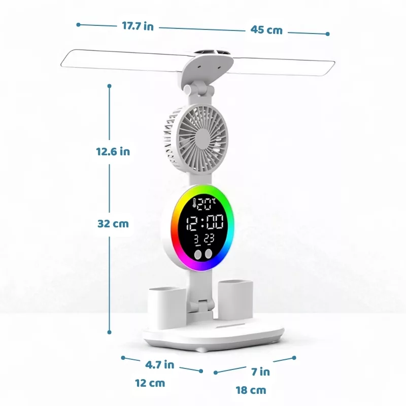 Esta lámpara es mi favorita. El ventilador es muy útil y me encanta tener el reloj justo ahí para estar en horario.