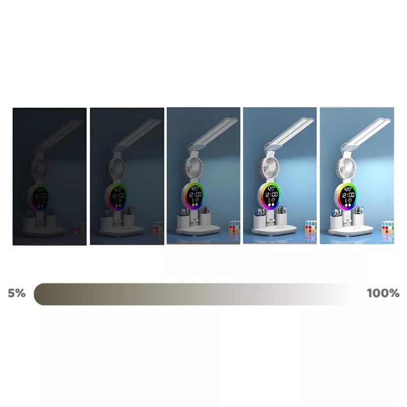 Uso la lámpara durante sesiones de estudio nocturnas. La luz regulable cuida mis ojos, además el ventilador es silencioso y no me distrae.
