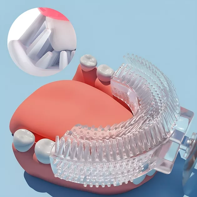 Eficaz - Gracias al exclusivo diseño en forma de U, nuestro cepillo llega a todos los rincones de la boca. Elimina manchas persistentes, previniendo la caries dental.