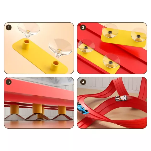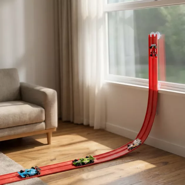 Me gusta que puedo construir una pista de carreras casi en cualquier lugar. Mi favorito es hacer zigzags en la puerta de mi habitación. Las ventosas funcionan también en paredes lisas.