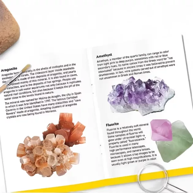 Guía educativa - Un folleto colorido explica el origen de cada ejemplar brillante. Los niños identifican cada hallazgo, ampliando fácilmente su conocimiento científico.