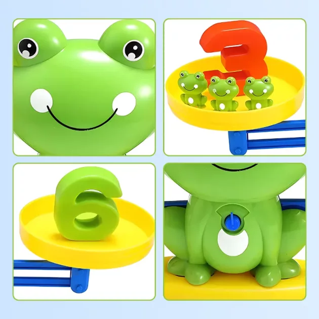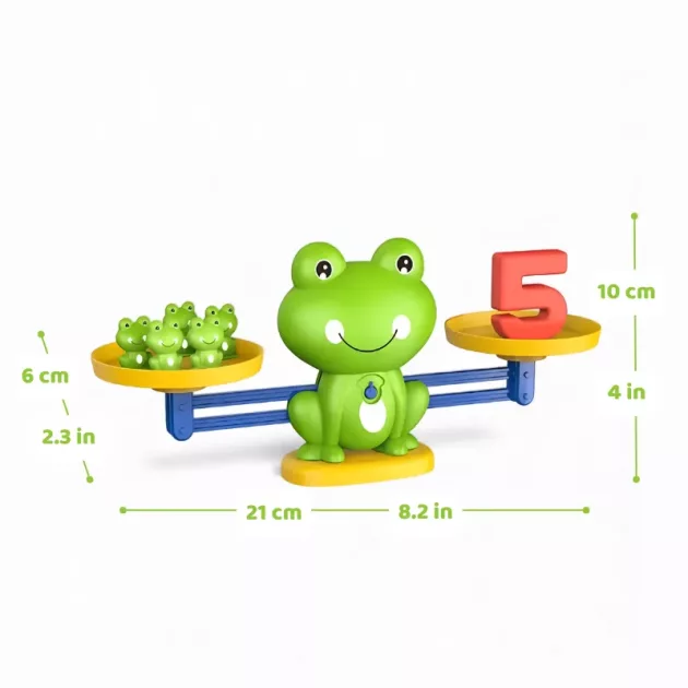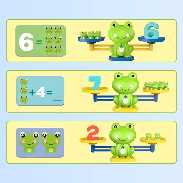 Nos divertimos mucho en días lluviosos averiguando cuántas ranas hacían que la balanza quedara equilibrada. Ahora a mi hijo le encantan las clases de matemáticas en la escuela también.