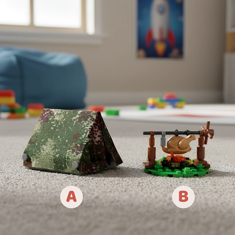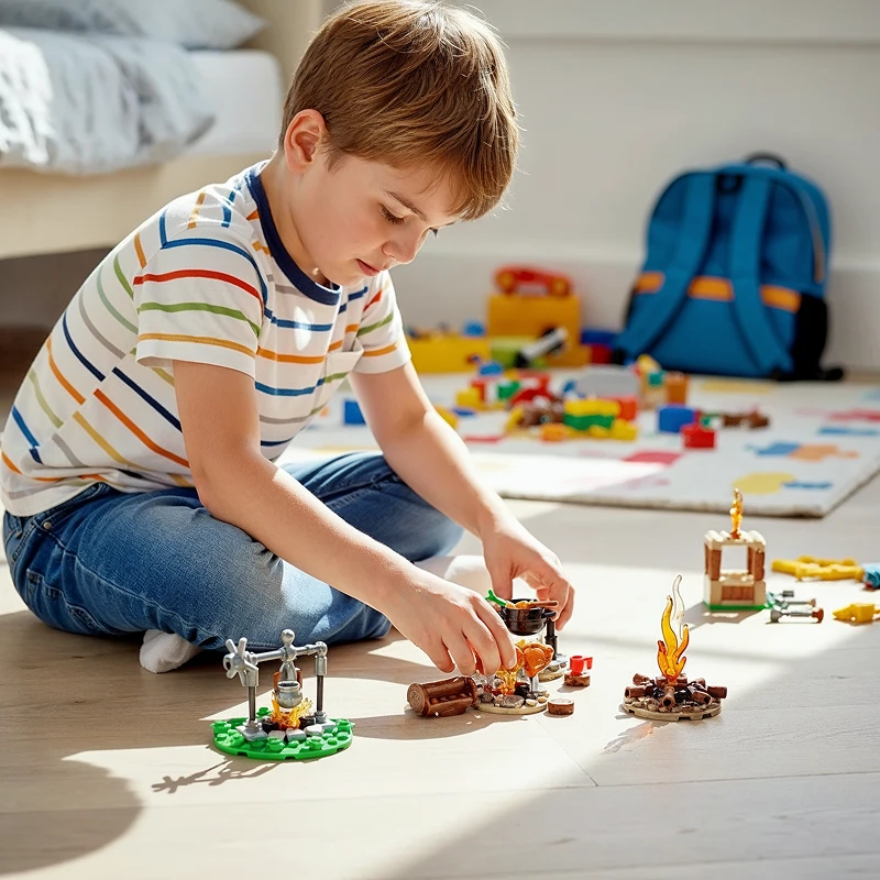 A veces construyo solo y a veces juego con mi amigo Max. Inventamos misiones secretas y nos reímos mucho.