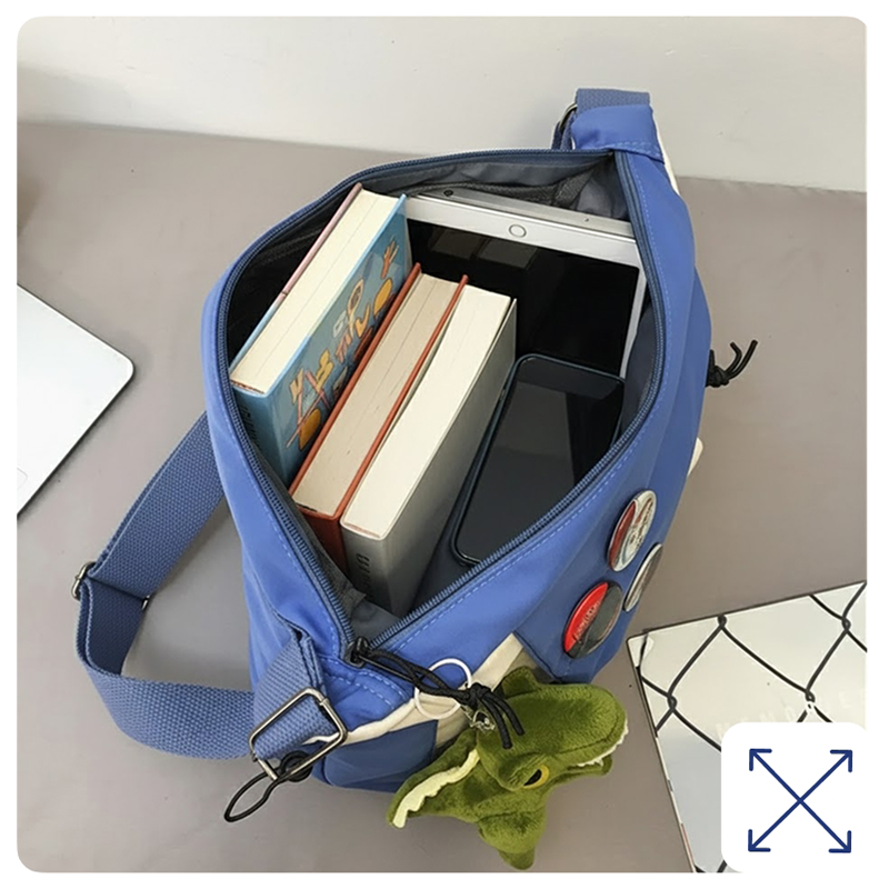 Esta bandolera es mi favorita después de la escuela. Caben mis bocadillos, mini juguete y cuaderno. Súper bonita y cómoda en mi hombro.