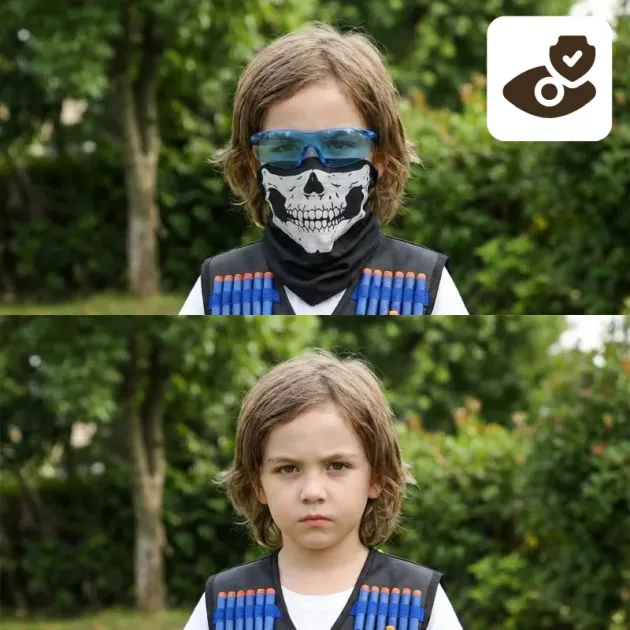 Mis amigos y yo usamos estos para nuestros juegos al aire libre. Me gustan los bolsillos para bocadillos y agua, y a mi mamá le gusta que mis ojos estén cubiertos.
