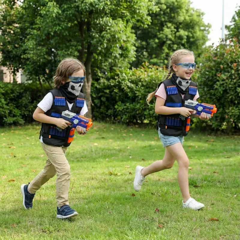 Mis amigos y yo usamos estos para nuestros juegos al aire libre. Me gustan los bolsillos para bocadillos y agua, y a mi mamá le gusta que mis ojos estén cubiertos.