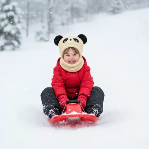 El divertido diseño panda hace que mi hijo quiera vestirse. Además, es suficientemente ajustado para los días de trineo.